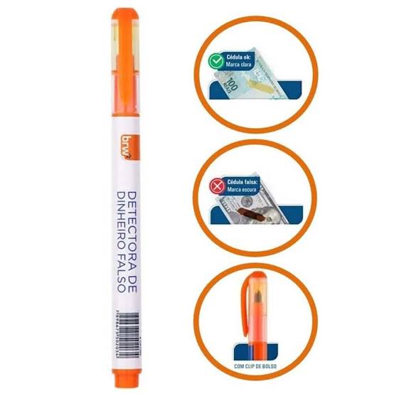 Caneta detectora de notas falsas da BRW — uma solução simples e prática para evitar prejuízos com cédulas sem valor legal. Basta riscar sobre a nota e observar: se a marca ficar clara ou amarela, a cédula é verdadeira; se escurecer, provavelmente é falsa. Produto com tinta especial não tóxica, ideal para uso diário em lojas, restaurantes, lanchonetes, papelarias e comércios em geral. Corpo leve, com clip de bolso para fácil transporte.